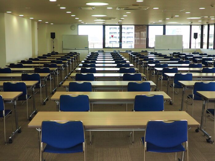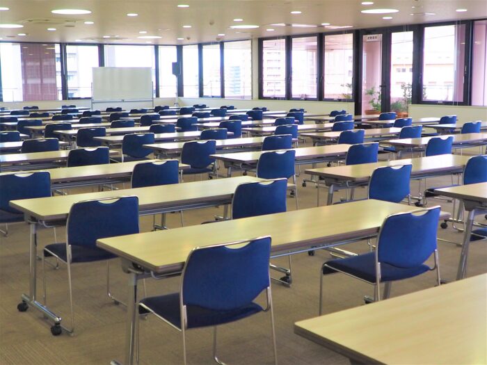 上記ページには記載していないコロナ対策の一つとして、「収容人数の制限」を行っております。弊社の貸し会議室の収容人数は、コロナ禍以前は、一つの机に対して、最大3名様まで座っていただく3名様掛けのレイアウトをご案内することが可能でした。しかし、1つの机に3名様が座りますと、隣の方との間隔が非常に狭くなってしまいます。密を避けるため、現在は、1つの机に最大2名様までのご案内とさせていただいております。そのため、会場の最大収容人数は、コロナ禍以前の人数の3分の2の数となっております。各会場の最大収容人数は下記数値でございます。