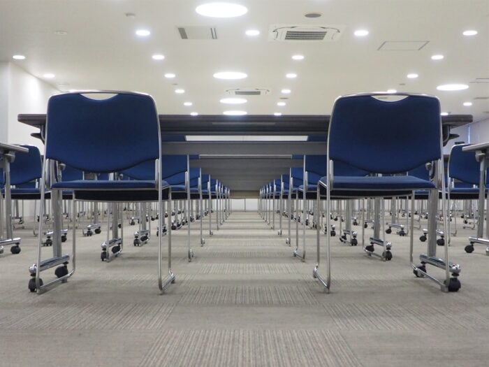 上記が8階大会議室に2名掛け最大収容人数のレイアウトでございますが、ここから、縦1列を抜いて横幅を更に広くしたり、横1列を少なくして縦幅に余裕を持たせたり、1名掛けにしたり、とお客様のご要望に応じて、レイアウトを変更していただくことが可能です。弊社貸し会議室では、事前にお客様より頂戴したレイアウトの作成をさせていただいております。「〇人で、なるべくソーシャルディスタンスを取りたい」「〇人で、会場を分けて利用したい」といったような、ご希望を頂戴できましたら、弊社より、お客様同士でコミュニケーションが一番取りやすいレイアウトをご提案させていただきます。ご希望のレイアウトがございましたら、お気軽にご相談くださいませ。