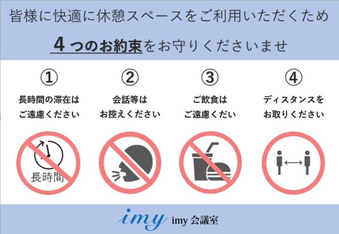 新型コロナウイルス感染防止のため、上記4つのお約束をお守りいただきますようお願い申し上げます。ご利用の皆様が、安心してimy会議室をご利用いただけるよう、ご理解・ご協力のほど、何卒よろしくお願いいたします。
