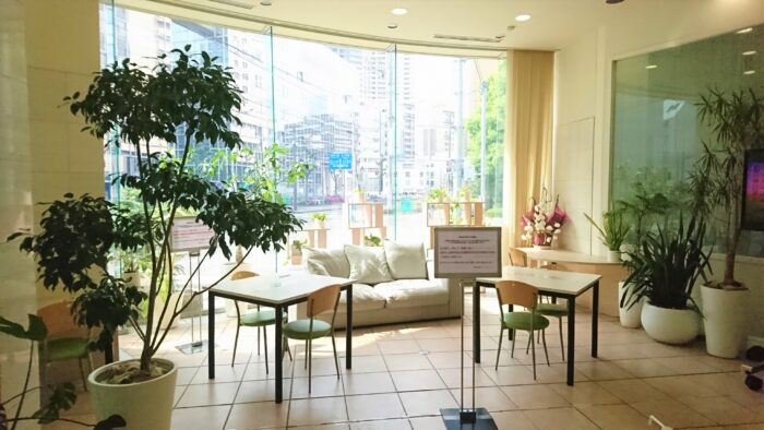 上にリンクを貼ったブログ記事には書かれておりませんが、新型コロナウイルス対策の一つとして、弊社貸し会議室のエントランス休憩スペースのご利用を停止させていただいておりました。休憩スペースは、お待ち合い、軽いお打ち合わせ、ご飲食等、長時間ご利用されるお客様も数多くいらっしゃいました。imy会議室のエントランスは天井も高く開放的なのですが、会話を楽しまれる方も数多くいらっしゃる場所なだけあり、感染のリスクが高い場所でございます。このように感染リスク回避のために停止していた休憩スペースの利用を、4月末より再開させていただきました。