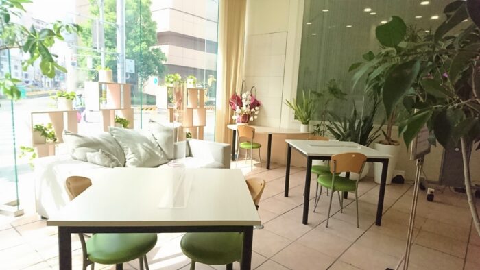 休憩スペース利用再開後には、観葉植物も緑がぱっと輝きを増して、心なしか生き生きとしているように感じられます。休憩スペースを開放したことで、エントランス全体に、明るい光がたくさん入り、気持ちのよい風がimyビル内に入ってまいります。imy会議室の事務所はエントランス休憩スペースに隣接しておりますので、事務所内もぱっと明るくなりました。気持ちよく業務に取りかかることができ、今まで以上に仕事がはかどります。今このブログも、エントランスからの明るい光を感じながら書いており、筆(注意:タイピングです)がすらすらと進むものでございます。