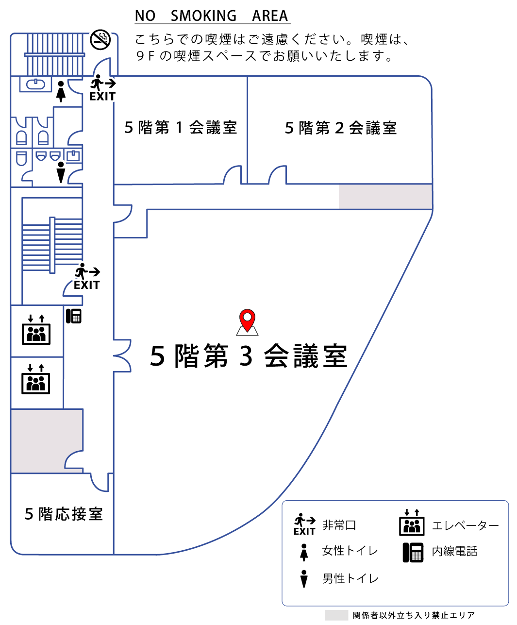 - ご利用後は電気・エアコンの電源をお切りいただきご退室ください。ご退室の際は、「各階エレベーター横の内線電話」または「1F事務所」までご連絡をお願いします。