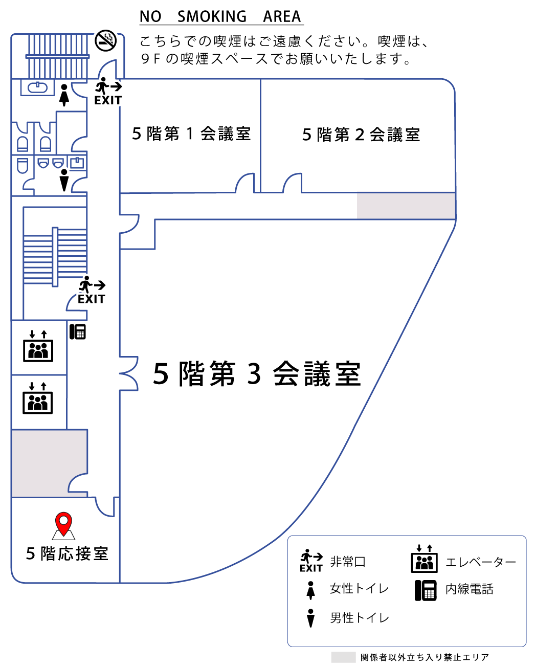 - ご利用後は電気・エアコンの電源をお切りいただきご退室ください。ご退室の際は、「各階エレベーター横の内線電話」または「1F事務所」までご連絡をお願いします。
