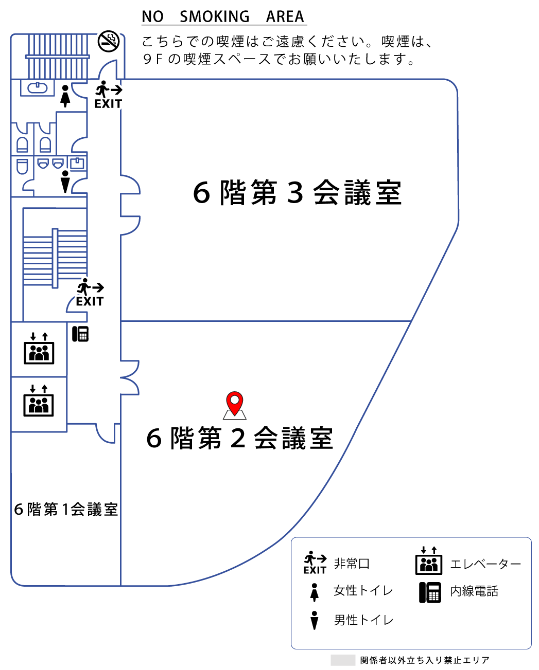 - ご利用後は電気・エアコンの電源をお切りいただきご退室ください。ご退室の際は、「各階エレベーター横の内線電話」または「1F事務所」までご連絡をお願いします。